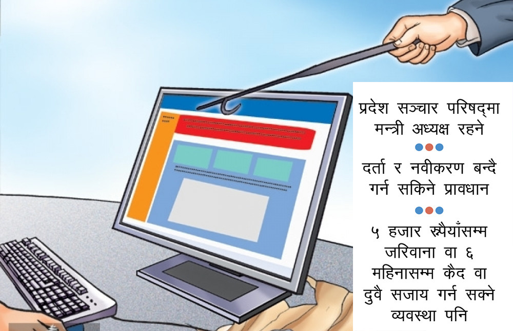 अनलाइन माध्यमले झूटा विवरण पेस गरेमा ५ हजार रुपैयाँ जरिवानाको व्यवस्था दफा ७६ मा छ भने ७७ मा निर्देशन उल्लंघन गरेमा १० हजार रुपैयाँसम्म जरिवाना वा एक वर्षसम्म कैद वा दुवै सजायको व्यवस्था गरेको छ । त्यसैगरी सञ्चारमाध्यमले राज्यले बन्देज गरेका विषयमा समाचार प्रकाशन र प्रसारण गरेमा सञ्चारमाध्यम बन्द गर्न सकिने उल्लेख छ ।