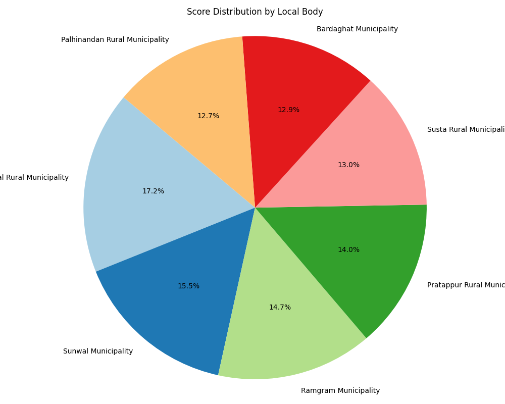 प्रतिवेदनअनुसार पाल्हीनन्दन गाउँपालिका कार्यसम्पादनमा सबैभन्दा कमजोर देखिएको छ। पाल्हीनन्दनले ४६.३३ अंक प्राप्त गरेको छ भने सुस्ता गाउँपालिकाले ४७.३८ अंक ल्याएको छ। नगरपालिकातर्फ बर्दघाट नगरपालिकाले ४७.१८ अंकसहित सबैभन्दा कम अंक प्राप्त गरेको छ। यसैगरी सुनवल नगरपालिकाले ५६.४२ र रामग्राम नगरपालिकाले ५३.६० अंक प्राप्त गरेका छन्। प्रतापपुर गाउँपालिकाले ५१.२६ अंक हासिल गरेको प्रतिवेदनमा उल्लेख छ।